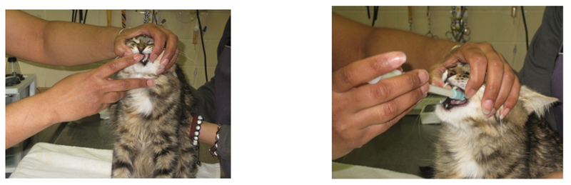 If you are giving liquid medications you do not need to open the mouth but just squirt it into the side of the mouth close to the back molars.